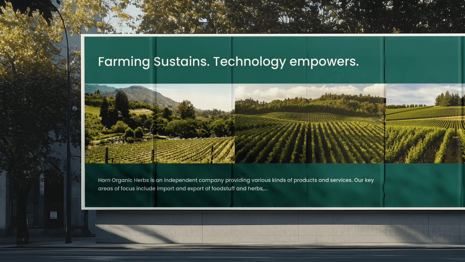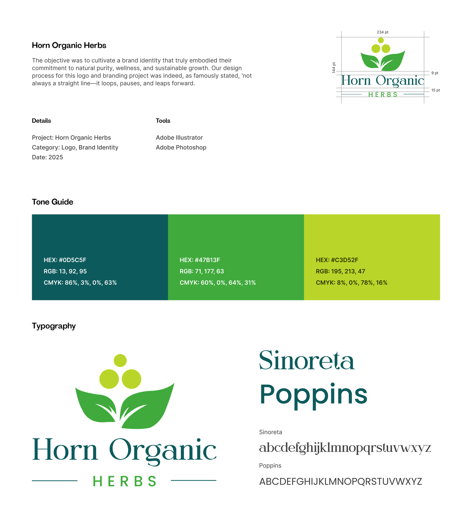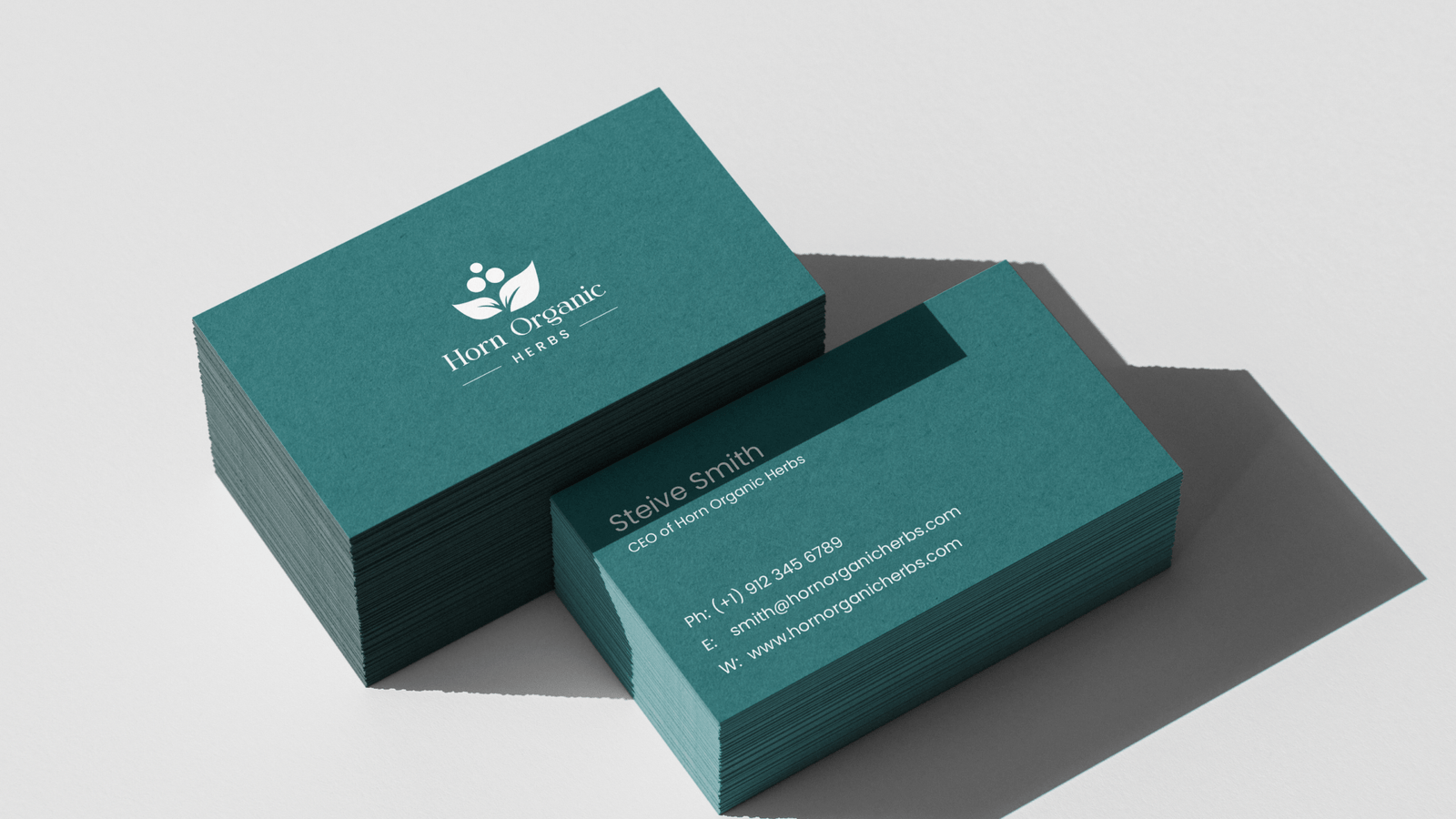 The “Horn Organic” branding features a minimalist design with a neutral color palette, emphasizing simplicity and professionalism. The typography is clean and modern, enhancing readability and aligning with the brand’s contemporary aesthetic. The overall design conveys a sense of sophistication and reliability, appealing to a professional audience.