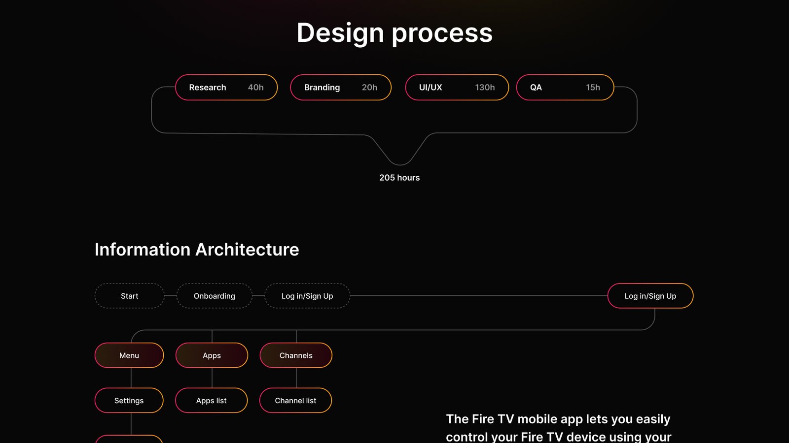 The Fire TV app design emphasizes a user-friendly interface optimized for television viewing. It incorporates a 10-foot UI approach, ensuring elements are large and spaced for readability from a distance. Navigation is streamlined with a focus on horizontal scrolling and clear visual hierarchies, facilitating easy content discovery. The design adheres to Amazon’s guidelines, utilizing responsive layouts and intuitive controls to enhance the user experience on large screens.